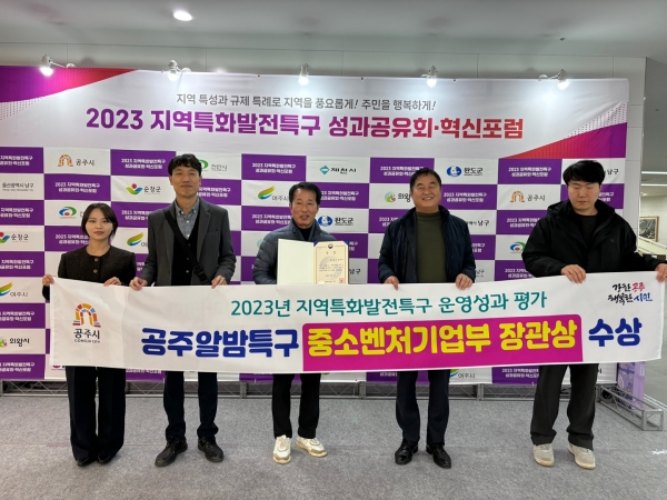 [세종타임즈] 공주시가 지난 11일 부산 UN평화기념관에서 중소벤처기업부 주관으로 개최된 ‘2023 지역특화발전특구 성과공유회’에서 우수 지역특구로 선정돼 중소벤처기업부 장관상을 받았다.
