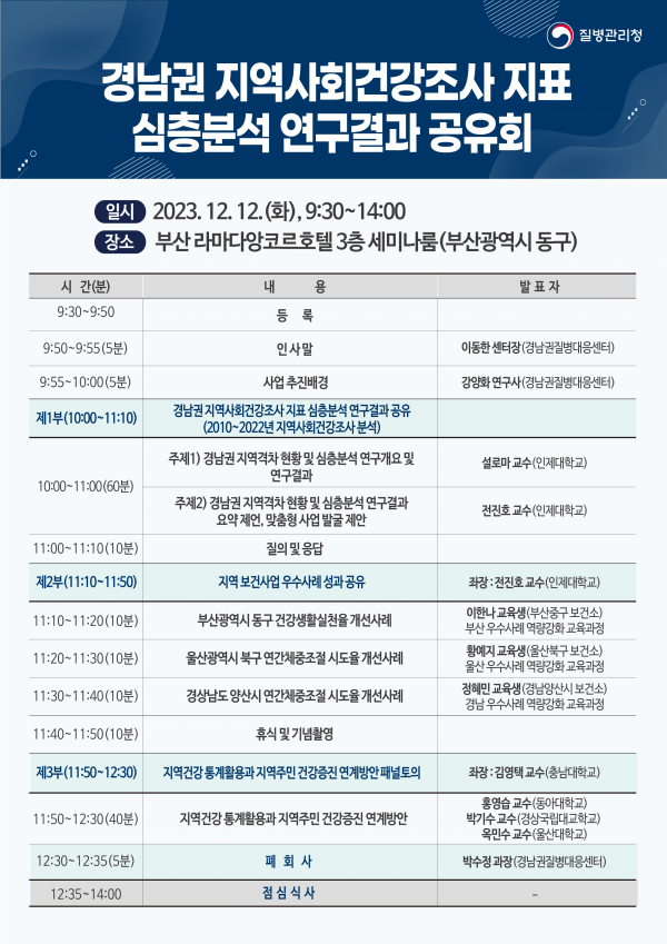 [세종타임즈] 질병관리청 경남권질병대응센터는 경남권 건강통계 활용과 지역 맞춤형 사업개발의 일환으로 인제대학교와 연구사업을 실시하고 그 결과를 12월 12일 부산 라마다앙코르호텔에서 공유한다.