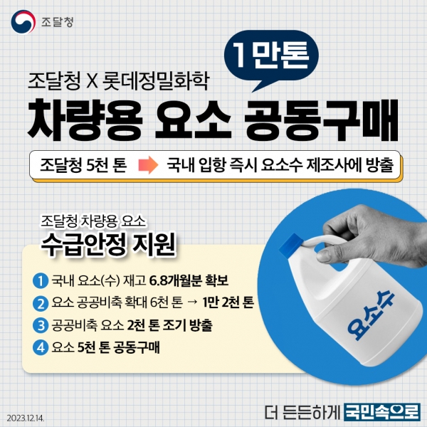 조달청은 차량용 요소 수급 안정을 위해 요소 공공비축 확대 → 12천톤), 공공비축 요소 약 2천톤 조기 방출 추진에 이어 금번 베트남산 요소 5천톤 공동구매까지 모든 가용한 수단을 동원하고 있다.
