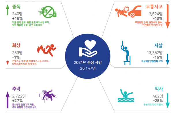 2021년 기준, 병·의원에서 치료를 받아야 했던 손상을 경험한 사람은 약 296만명 , 구급차로 이송한 손상환자는 55만명이었으며 사망원인통계에 따르면 26,147명이 손상으로 사망해 코로나 이전인 ’19년 대비 손상 발생 및 사망이 감소한 것으로 확인되었으나, 국민건강보험통계에서 손상으로 인한 진료비는 ’21년 5.3조원으로 최근 10년간 가장 많은 것으로 나타나 손상이 건강과 사회에 미치는 영향이 심각했다.