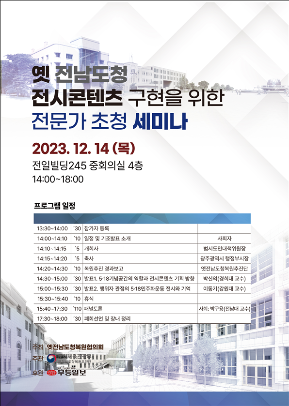[세종타임즈] 문화체육관광부와 광주광역시, 옛전남도청복원범시도민대책위로 구성한 옛전남도청복원협의회는 12월 14일 오후 2시, 전일빌딩245 중회의실에서 ‘옛 전남도청 전시콘텐츠 구현을 위한 전문가 초청 세미나’를 개최한다.