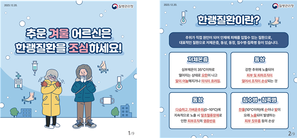 질병관리청 지영미 청장은 “한랭질환은 사전에 적절한 조치로 사고를 방지할 수 있으므로 한파 대비 건강수칙을 준수해 줄 것”을 당부하며 특히 “한파에 취약한 65세 이상 어르신과 노숙인, 독거노인 등 취약계층에 대해 각별한 관심이 필요”하다고 거듭 강조했다.