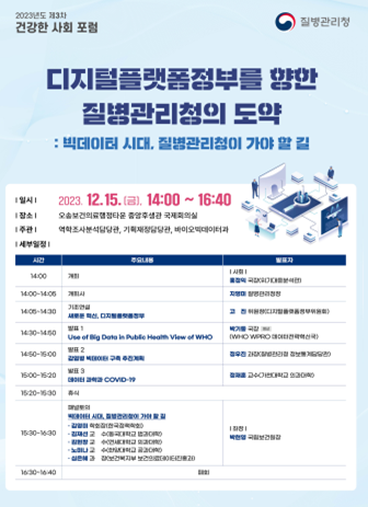[세종타임즈] 질병관리청은 12월 15일 ‘디지털플랫폼정부를 향한 질병관리청의 도약’을 주제로 ‘제3차 건강한 사회 포럼’을 개최한다고 밝혔다.