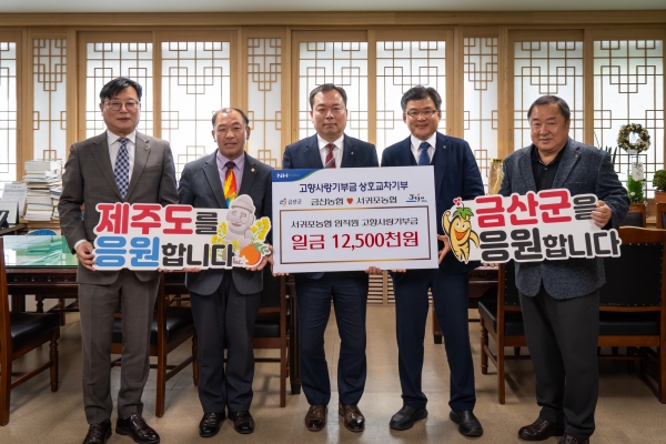 금산농협과 서귀포농협은 올해 자매결연 35주년을 기념해 고향사랑 상호 교차 기부를 추진하며 이날 서귀포농협 임직원 125명이 참여한 고향사랑기부금 1250만원을 금산군에 기부했다.