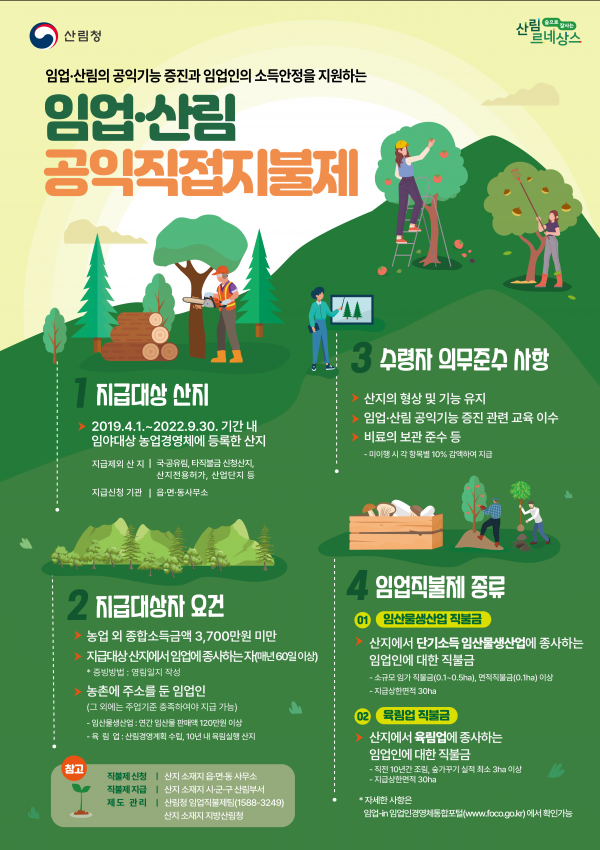 산림청 이홍대 임업직불제팀장은 “올해부터 임업직불제 통합관리시스템을 통해 온라인 신청이 가능해짐에 따라 임업직불금 혜택에서 누락되는 일이 없도록 온라인 또는 방문해 신청해 주시기 바란다”며 “앞으로도 임업인이 더 만족할 수 있는 정책이 되도록 예산 확대와 편의 증진에 적극적으로 노력하겠다”고 말했다.