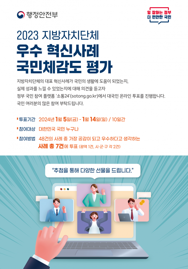 [세종타임즈] 행정안전부는 2023년 지방자치단체 혁신평가의 일환으로 국민이 직접 참여하는 ‘국민체감도 평가’를 오는 1월 14일까지 실시한다고 밝혔다.