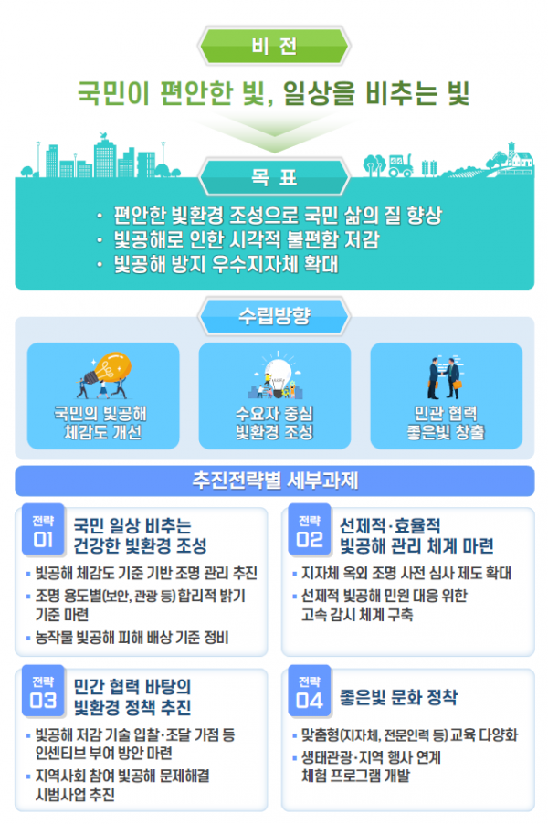 이번 계획은 ‘국민이 편안한 빛, 일상을 비추는 빛’이라는 비전 아래 ‘편안한 빛환경 조성으로 국민 삶의 질 향상’을 목표로 4대 추진전략과 12개 세부과제로 구성됐다.