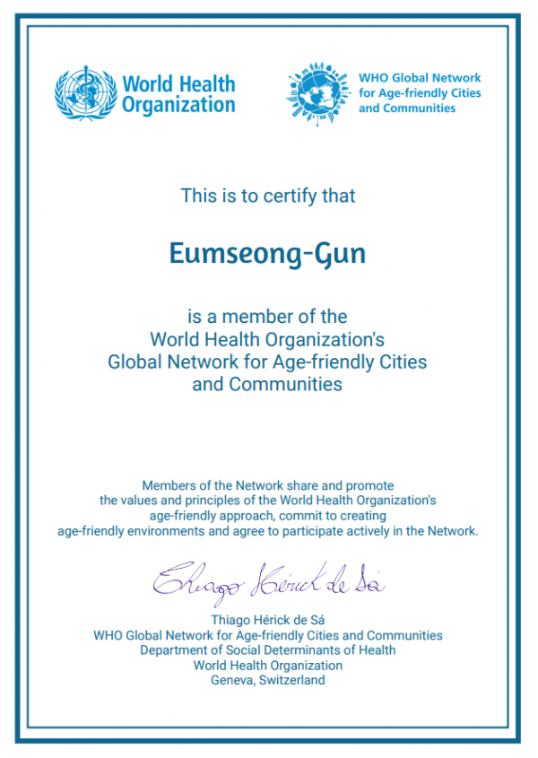 이어 지난해 12월에는 고령친화도시 3개년 계획을 영어로 번역해 WHO에 고령친화도시 가입인증 신청 결과 음성군은 국내 54번째, 충북에서는 최초로 가입인증을 획득했다.