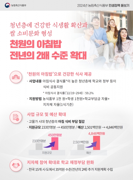 [세종타임즈] 농림축산식품부는 청년층의 아침밥 먹는 건강한 식생활 확산을 위해 대학교와 함께 추진해 온 ‘천원의 아침밥’사업을 올해는 전년 대비 약 2배 늘어난 450만명분 규모로 대폭 확대한다.