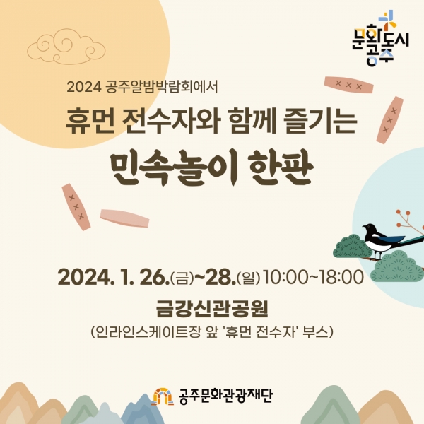 체험부스는 “휴먼 전수자와 함께 즐기는 민속놀이 한판”이라는 주제로 2024 공주알밤박람회 운영기간인 2024년 1월 26일부터 1월 28일 10:00~오후 6시에 금강신관공원 인라인스케이트장 앞에서 진행된다.