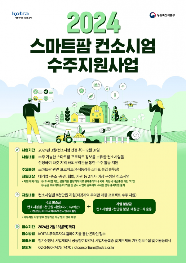 2024년 새롭게 편성된 ‘스마트팜 컨소시엄 수주지원’은 해외 수주 사업 계획을 보유한 지능형농장 수출기업 컨소시엄을 선발, 해당 사업을 전담·밀착 지원하는 사업이다.