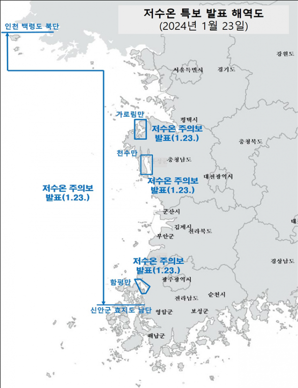 [세종타임즈] 해양수산부는 국립수산과학원이 서해 중부 연안과 서해 내만 해역에 저수온 주의보를 발표함에 따라, 1월 23일 10시부로 저수온 위기경보 단계를 주의에서 경계 단계로 상향했다.