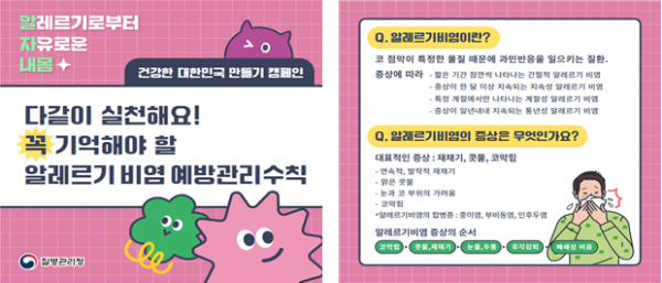알레르기질환 예방관리수칙은 질병관리청 누리집과 국가건강정보포털에 리플릿과 카드뉴스로 게재했으며 향후 지자체, 아토피·천식 교육정보센터, 관련 학협회와 함께 예방관리 교육·홍보 자료로 활용할 계획이다.