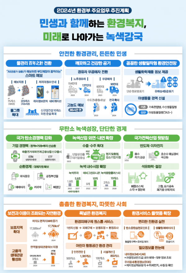 환경부는 작년 업무계획 추진 성과를 이어가되, 변화하는 행정수요에 발 빠르게 대응할 수 있도록 2024년 업무계획을 수립했다.