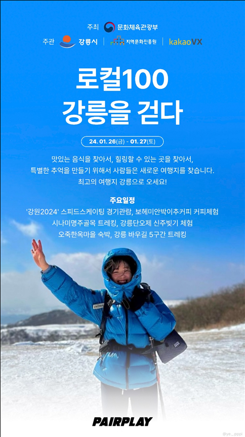 한편 이번 강릉편은 ‘로컬100, 00을 걷다’의 시범사업으로 지역문화진흥원은 카카오브이엑스, ‘로컬100’ 지자체와 함께 지역별로 공식 상품을 출시해 내외국인 걷기 여행객에게 소개할 계획이다.