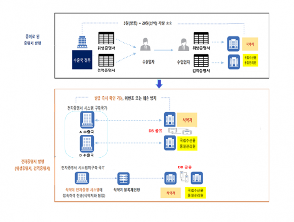 현재 각 기관의 위생·검역 증명서 서식이 다르고 서로 증명서 정보를 공유할 수 있는 체계가 구축되지 않아 수입자는 각 기관이 전자증명서 시스템을 직접 구축한 국가에 한해서만 전자증명서로 제출하고 이외의 국가에는 종이 증명서로 제출해야 하는 불편함이 있었다.