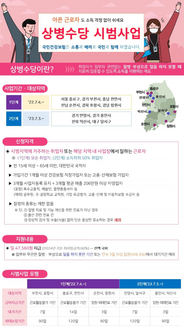상병수당 시범사업은 근로자가 업무 외 질병·부상 발생으로 경제활동이 어려운 경우 치료에 집중할 수 있도록 소득을 보전하는 제도로 시행 이후 총 9,774건이 지급됐으며 1인당 평균 18.5일 84.7만원을 수급받았다.