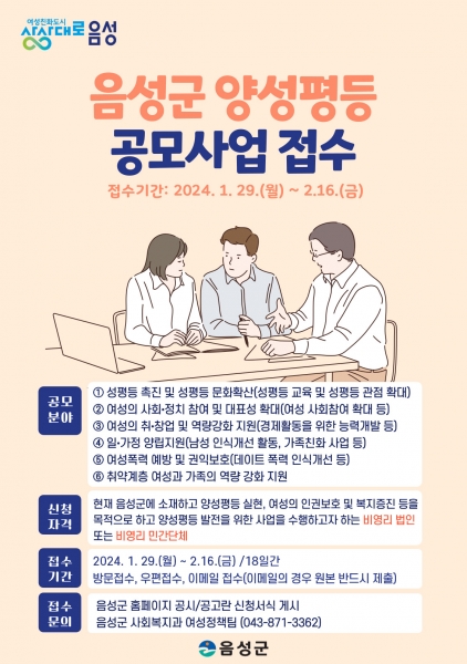 [세종타임즈] 음성군은 다양한 사업 발굴과 지원을 통해 민간단체의 정책참여 기회를 제공하기 위한 2024년 음성군 양성평등 공모사업을 추진한다.