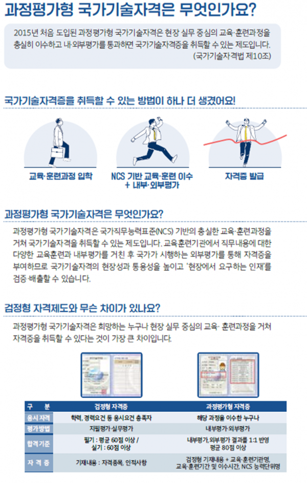 ‘과정평가형 국가기술자격’은 필기시험 중심의 검정형 자격과 달리 학력·경력과 무관하게 현장 실무 중심으로 설계된 교육·훈련 과정을 이수하고 실기 위주의 평가에 합격하면 국가기술자격을 부여하는 제도이다.
