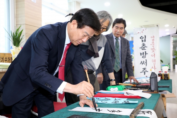 이날 한국예술문화단체총연합회 금산군지회 회원들이 한 해의 다복과 경사를 기원하는 ‘입춘대길 건양다경’ 글귀를 직접 써 군청을 방문하는 민원인들에게 무료로 배부했다.