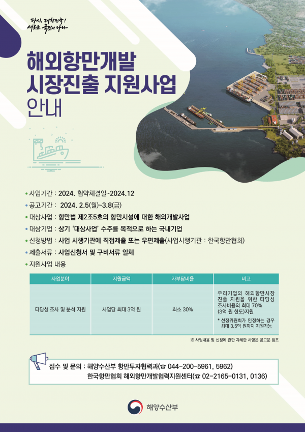 [세종타임즈] 해양수산부는 2월 5일부터 3월 8일까지 ‘2024년도 해외항만개발시장 진출 지원사업’ 대상사업을 모집한다.