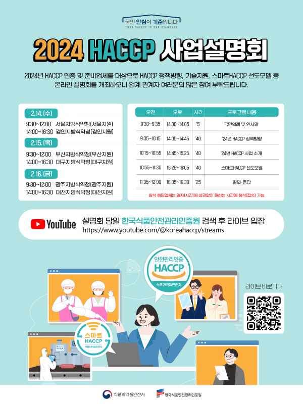 [세종타임즈] 식품의약품안전처와 한국식품안전관리인증원은 식품안전관리인증기준 적용 업체 등을 대상으로 올해 해썹 추진 정책 방향과 해썹 지원사업을 안내하기 위해 한국식품안전관리인증원과 함께 ‘2024년 해썹 사업 온라인 설명회’를 개최한다고 밝혔다.