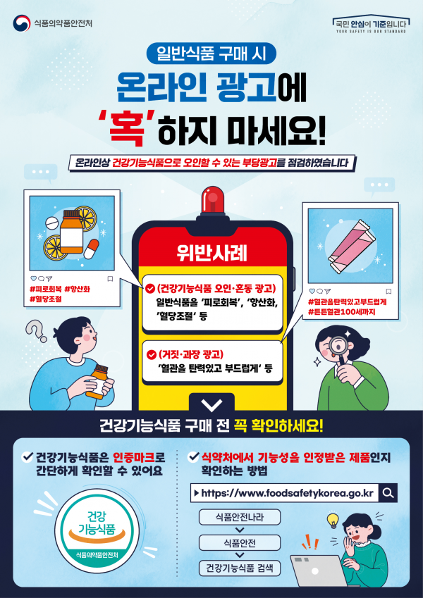 이번 점검 결과 일반식품을 건강기능식품으로 오인하게 만드는 부당광고가 다수 적발된 만큼, 식약처는 소비자에게 온라인상에서 식약처로부터 기능성을 인정받은 ‘건강기능식품’ 제품을 구매하고자 하는 경우 제품에 표시된 ‘건강기능식품 인증마크’를 확인하고 구매할 것을 당부했다.