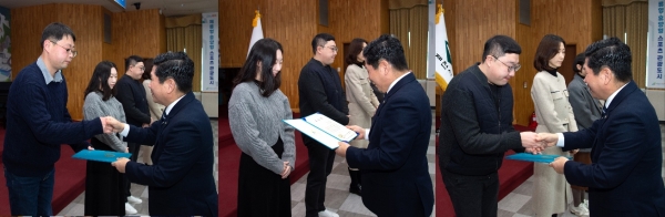 이에 시는 매년 상·하반기 각 3명의 일상감사 우수위원을 표창하고 있으며 올해도 2월 정례 직원조회를 통해 작년도 하반기 성과를 토대로 건설과 강석민 주무관, 홍보학습담당관 김소희 주무관, 회계과 서현석 주무관에 대한 표창을 수여했다.