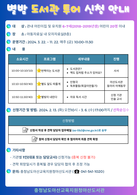 [세종타임즈] 충청남도아산교육지원청아산도서관은 2024년 2월 13일 부터 선착순으로 도서관 견학 프로그램‘별밤 도서관 투어’참여기관을 모집한다.