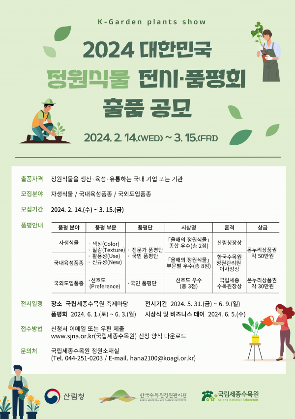 한편 ‘2024년 대한민국 정원식물 전시·품평회’는 오는 5월 31일부터 6월 9일까지 국립세종수목원 전시원 일원에서 개최될 예정이다.