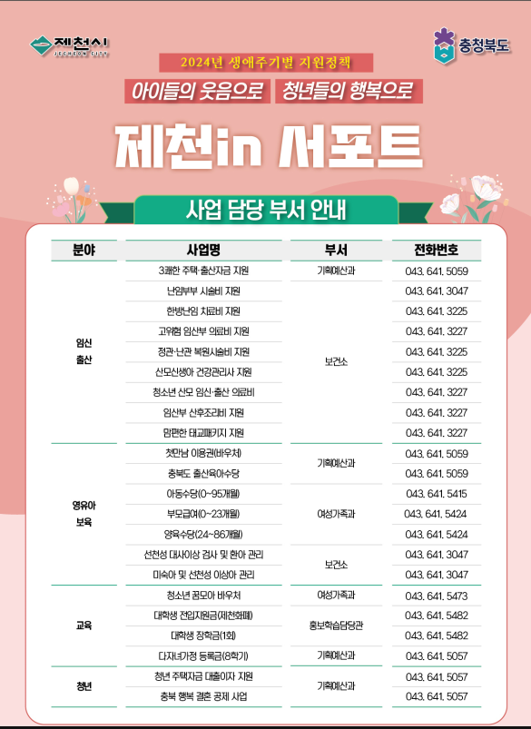 시 관계자는“제천 시민이면 받을 수 있는 혜택을 한눈에 볼 수 있도록 생애주기별 지원정책 홍보물을 제작했다”며 “인구감소 대응을 최우선 과제로 삼고 시민 모두 살기 좋고 행복한 제천 만들기에 최선을 다하겠다”고 말했다.