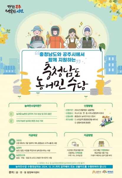 [세종타임즈] 공주시는 농어업인의 기본소득을 보장하고 지속 가능한 농어업 환경을 조성하기 위해 '농어민수당' 신청을 오는 4월 19일까지 접수한다고 발표했다.