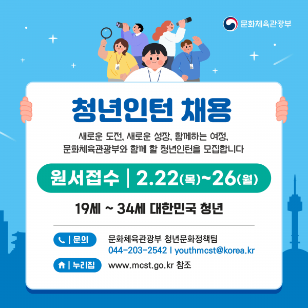 상반기 채용 공고는 2월 16일 문체부 누리집과 인사혁신처 나라일터에 게시하며 2월 22일부터 26일까지 원서를 접수한다.