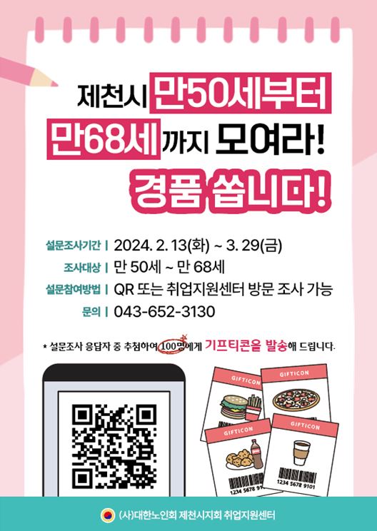 제천시민 인생 2막을 위한 실태 및 욕구 조사는 주민등록상 제천시민 만 50세 ∼ 만 68세를 대상으로 하며 QR과 취업지원센터로 직접 방문 조사로 참여할 수 있다.