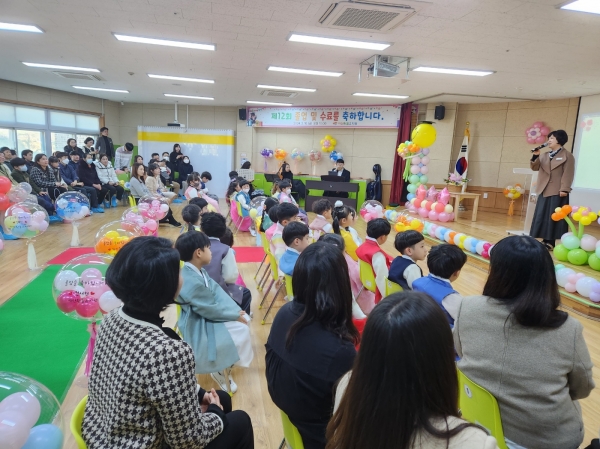 식전행사로 유아들이 좋아하는 3곡 현악3중주 공연을 들은 후 개식, 국민의례, 졸업장 및 상장 수여, 원장선생님 인사말, 교육감 축하 동영상 시청, 놀이 영상 감상, 원가제창, 꽃다발 증정, 폐식 순으로 진행됐다.