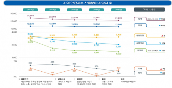 [세종타임즈] 행정안전부는 2022년 통계를 기준으로 교통사고 화재, 범죄, 생활안전, 자살, 감염병 등 6개 분야의 지방자치단체의 안전역량을 나타내는 2023년 지역 안전지수를 공표했다.