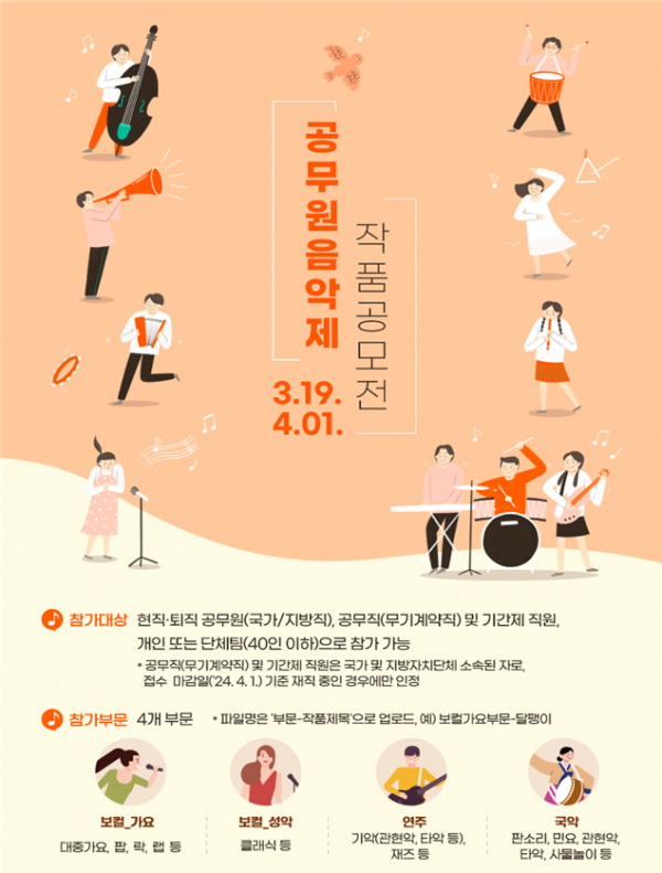 인사혁신처와 공무원연금공단은 다음달 19일부터 4월 1일까지 ‘2024년 공무원 음악제’ 출품 작품을 공모한다고 20일 밝혔다.