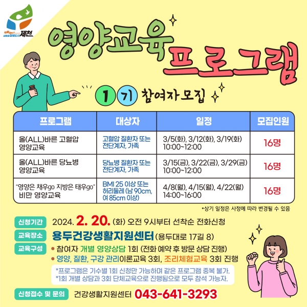 [세종타임즈] 제천시 용두 건강 생활지원센터에서 2024년 1기 영양 프로그램 참여자를 모집한다.