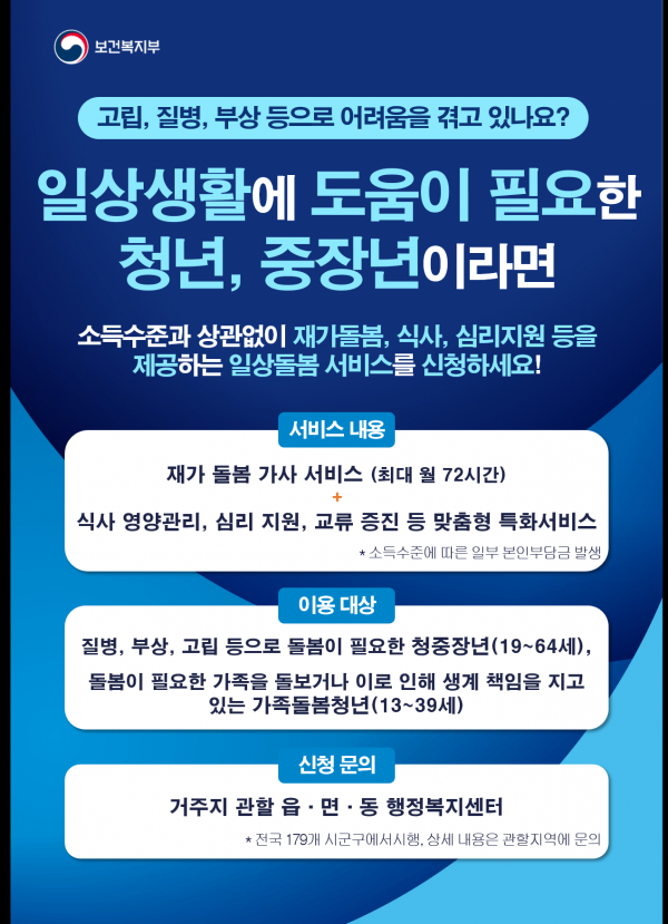‘일상돌봄 서비스’는 혼자서 일상생활을 수행하기 어려운 중장년과 청년의 삶의 질을 높이기 위해 재가 돌봄서비스와 식사지원, 심리지원 등을 통합적으로 제공하는 서비스다.