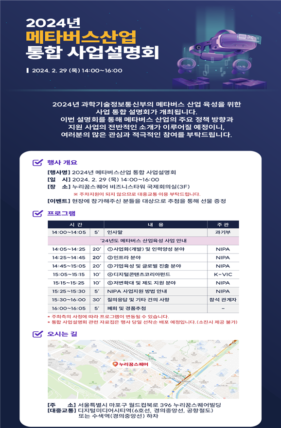 이번 통합 사업설명회의 녹화본은 추후 유튜브에 게시될 예정이며 메타버스 주요 사업별 지원 자격, 신청 방법, 추진 일정 등 보다 자세한 사항은 과기정통부와 정보통신산업진흥원 홈페이지 를 통해 확인할 수 있다.