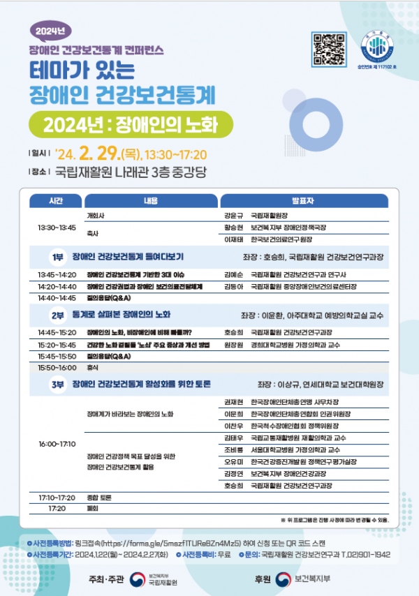 종합토론은 ▲장애계가 바라보는 장애인의 노화와 ▲장애인 건강정책 목표 달성을 위한 장애인 건강보건통계 전망에 대해 집중 논의할 예정이다.