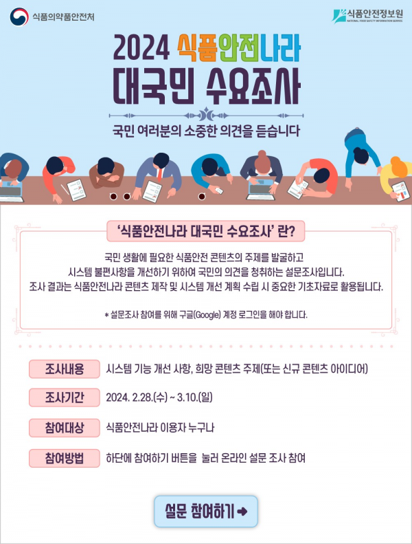 수요조사는 식품안전나라 누리집 알림창에서 ‘설문 참여하기’를 선택하면 참여할 수 있으며 제출된 의견은 식품안전나라 기능 개선과 콘텐츠 개발 등에 활용할 계획이다.