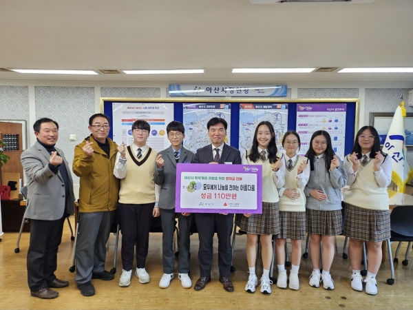 조일교 아산시 부시장은 “학생들의 장학금으로 마련한 성금에 큰 감동을 느낀다”며 “이 소중한 성금은 학생들의 따뜻한 마음을 담아 지역 내 어려운 청소년들에게 잘 전달하고 지속적인 관심을 기울이겠다”고 말했다.