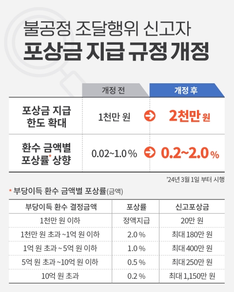 조달청은 불공정 조달행위 관련 신고 활성화를 위해 ‘불공정 조달행위 신고자에 대한 포상금 지급에 관한 규정’을 3월 1일부터 개정 시행해 신고 보상 규모를 국민이 체감할 수 있는 수준으로 대폭 확대한다.