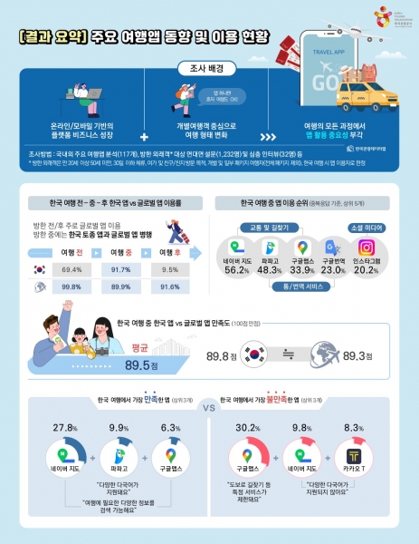 이러한 트렌드에 따라 문화체육관광부와 한국관광공사는 국내외 주요 여행 앱 분석, 외래객 대상 여행 앱 이용 현황, 한국 여행 시 앱 이용자로 한정함 /조사 기간 : ’23.10.31.~12.6.) 등을 다각적으로 조사·분석한 ‘주요 여행 앱 동향 및 이용 현황 조사’ 결과를 발표했다.