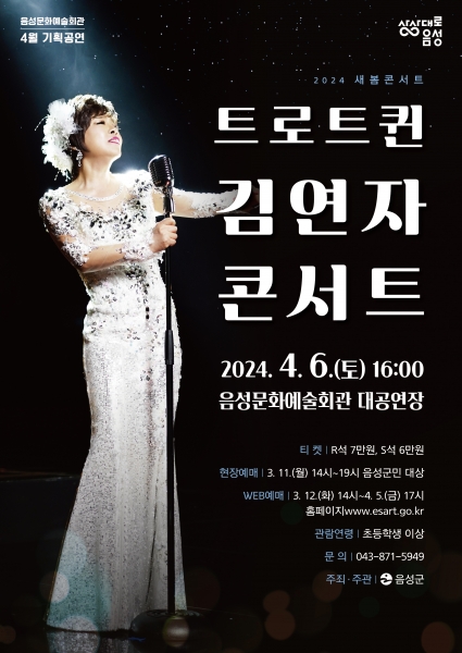 [세종타임즈] 음성군은 2024년 새봄을 맞이해 오는 4월 6일 토요일 오후 4시 음성문화예술회관 4월 기획공연으로 트로트 퀸 김연자의 라이브 콘서트를 진행한다.