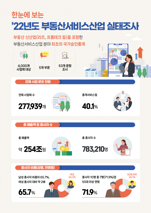 [세종타임즈] 국토교통부는 전국에서 부동산서비스산업을 영위하고 있는 표본 4천 개의 사업체를 대상으로 조사한 2022년도 부동산서비스산업 실태조사 결과를 공표했다.
