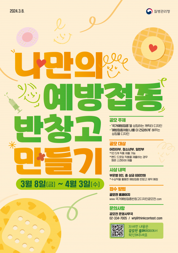 질병관리청 임숙영 의료안전예방국장은 “이번 공모전을 통해 예방접종이 국민들에게 보다 친숙하게 다가갈 수 있을 것으로 기대한다”며 “공모전에 많은 관심과 참여를 부탁드린다”고 전했다.