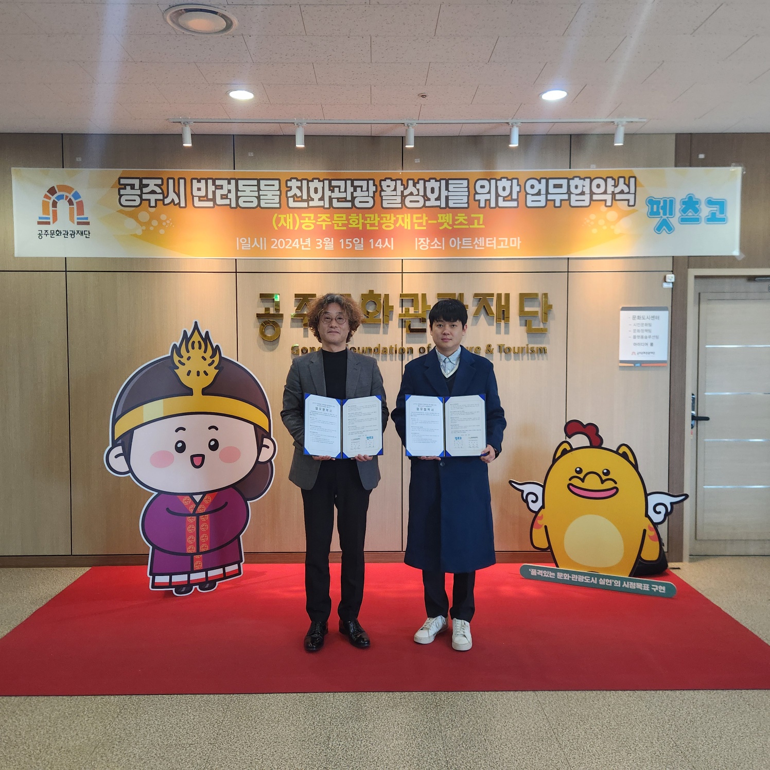 [세종타임즈] 공주문화관광재단과 ㈜펫츠고트래블은 공주시의 반려동물 친화관광 활성화를 위해 지난 15일 아트센터 고마에서 업무협약을 체결했다고 밝혔다.
