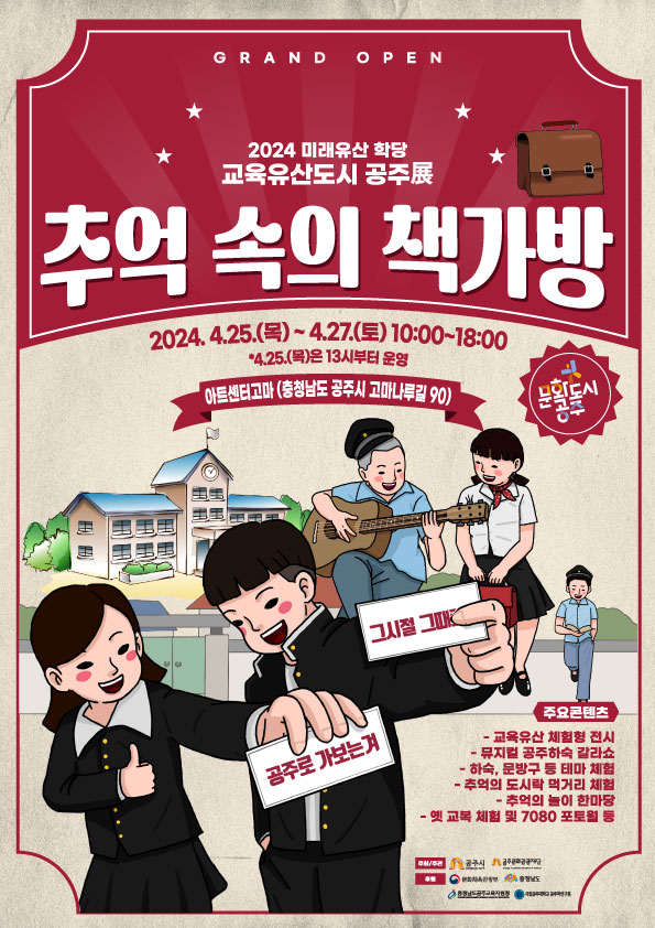 [세종타임즈] 공주문화관광재단은 공주문화도시조성사업의 일환으로 2024년 교육유산도시 공주展 '추억 속의 책가방'을 오는 4월 25일(목)부터 4월 27일(토)까지 아트센터 고마에서 3일간 개최한다고 밝혔다.